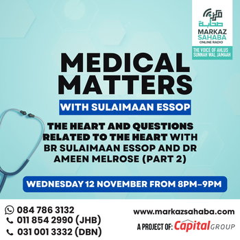 The HEART and questions related to the Heart with Br Sulaimaan Essop and DR Ameen Melrose Listen Live - https://ndstream.net/markazsahaba/pc.htm https://radio.garden/listen/markaz-sahaba/DkHOTqbS Catch Medical File Podcast : https://iono.fm/c/4067