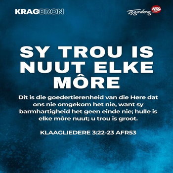 Dit is die goedertierenheid van die Here dat ons nie omgekom het nie, want sy barmhartigheid het geen einde nie; hulle is elke môre nuut; u trou is groot. KLAAGLIEDERE 3:22-23 AFR53