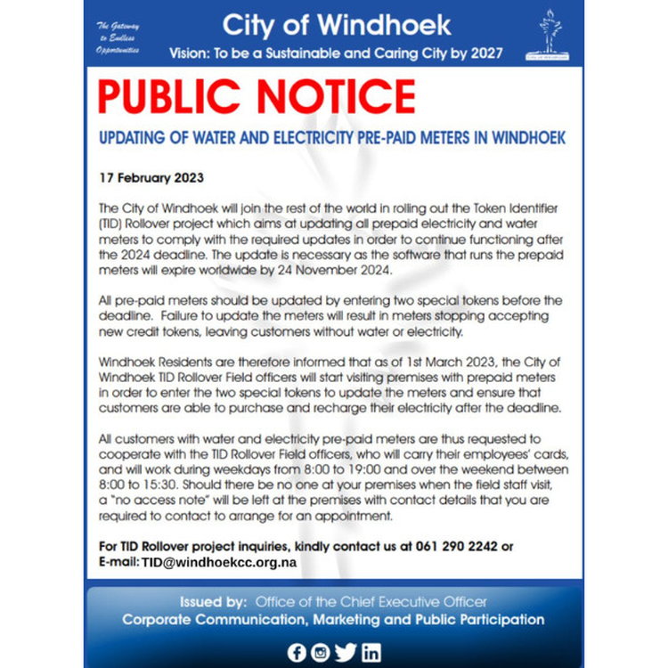 The City of Windhoek will join the rest of the world in rolling out the Token Identifier (TID) Rollover project which aims at updating all prepaid electricity and water meters to comply with the required updates in order to continue functioning after the 2024 deadline. The update is necessary as the software that runs the prepaid
