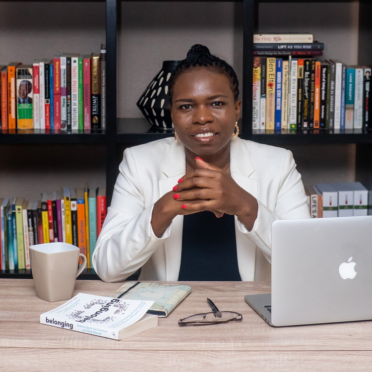 A woman of colour sitting at a desk with a laptop open in front of her. She is wearing a white blazer over a dark top, has short black hair, and is wearing gold hoop earrings. Her hands are clasped together in front of her, and she has red nail polish on her nails. On the desk, there is a white mug, a book titled "belonging", and a pair of glasses to her right.