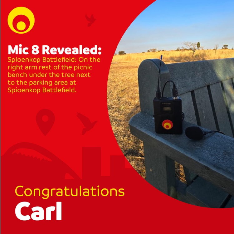 CONGRATULATIONS to our eighth BUG winner Carl, who guessed the correct location. The Bug was at Spioenkop Battlefield: On the right arm rest of the picnic bench under the tree next to the parking area at Spioenkop Battlefield. WhatsApp 'Bug' to 061 700 0800. Visit the link in our bio for more info. T’s and C’s apply.